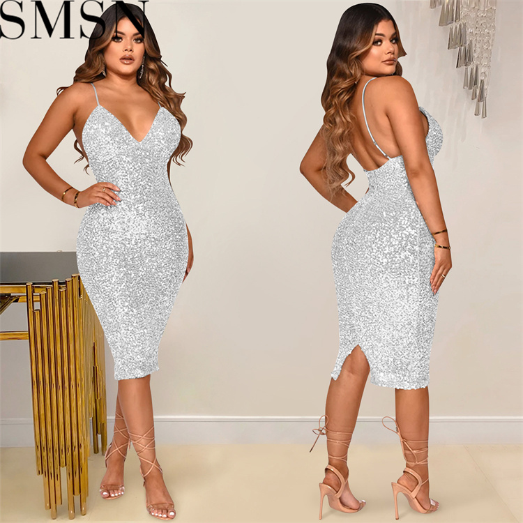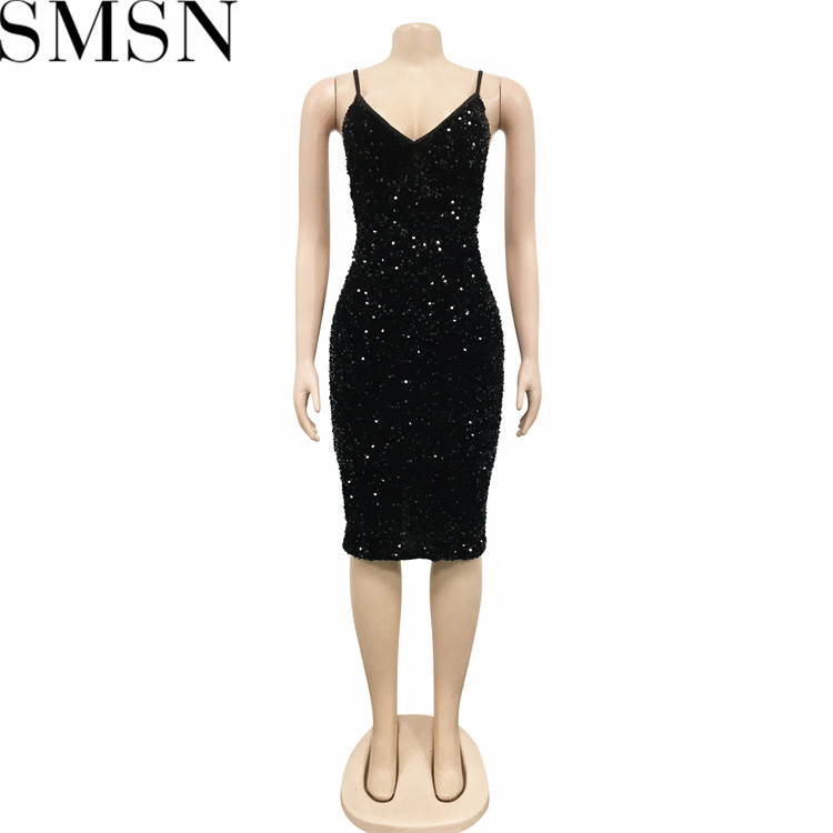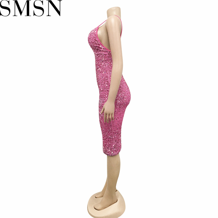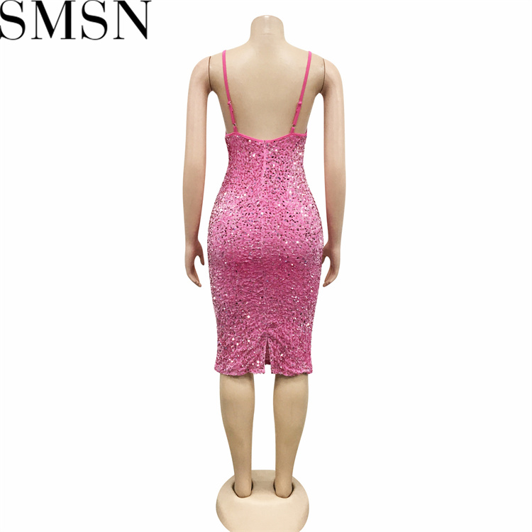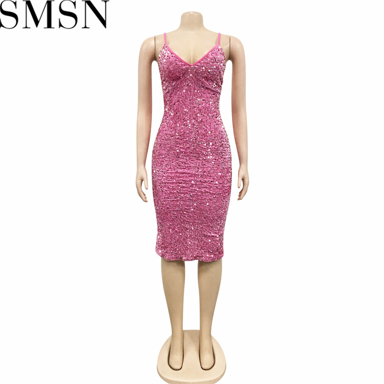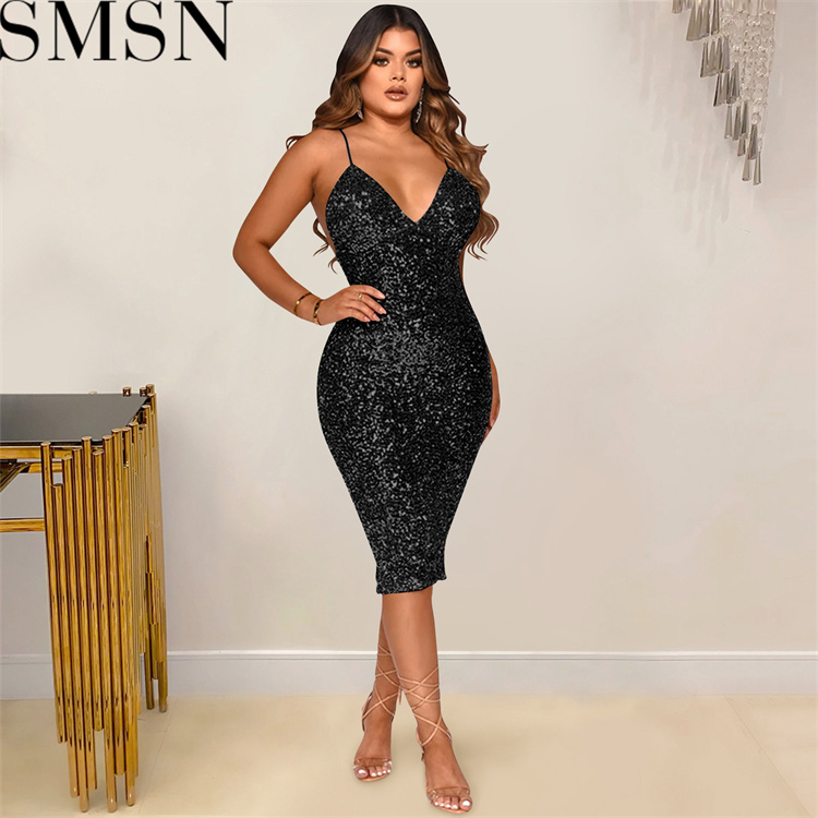 Casual Dress new pure color sequins sexy V neck brace midi dress for women