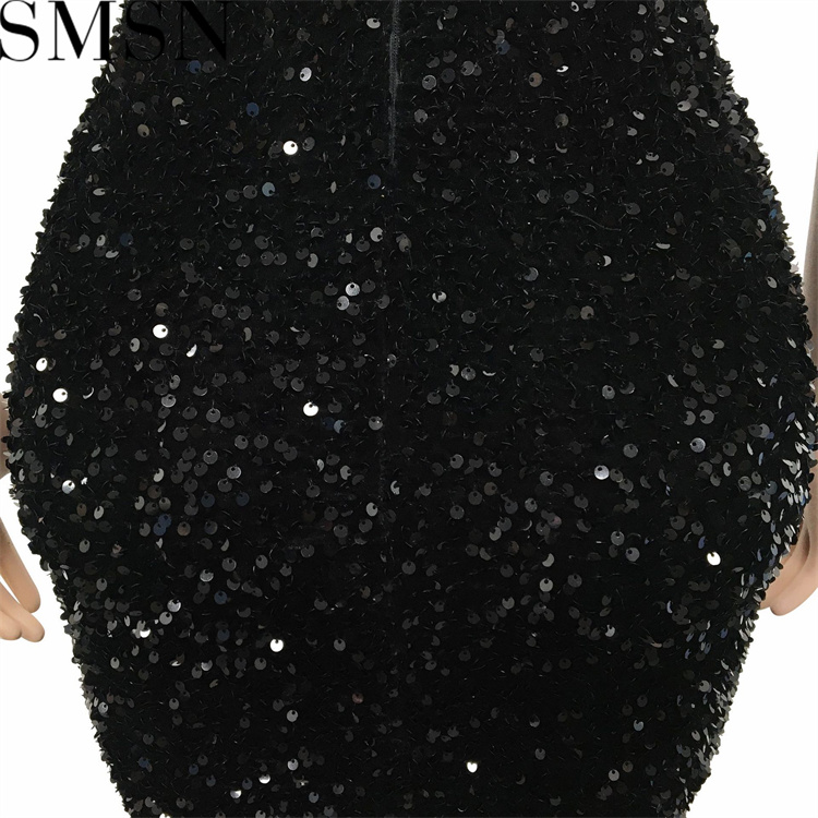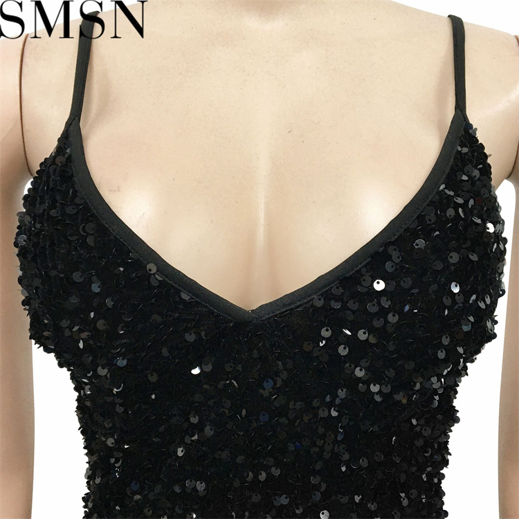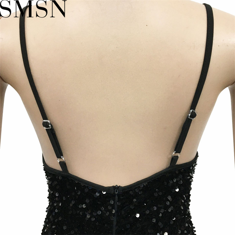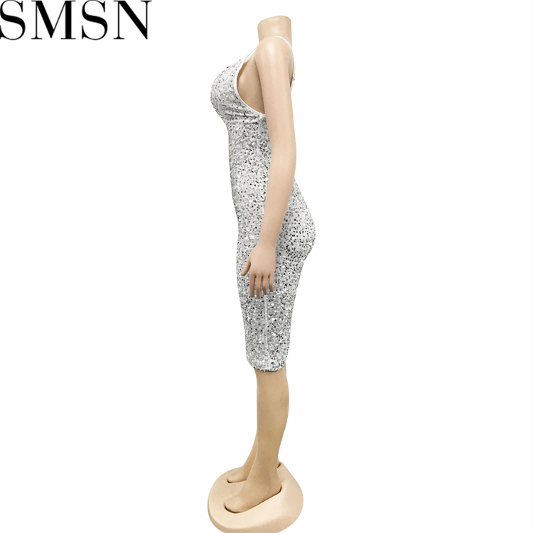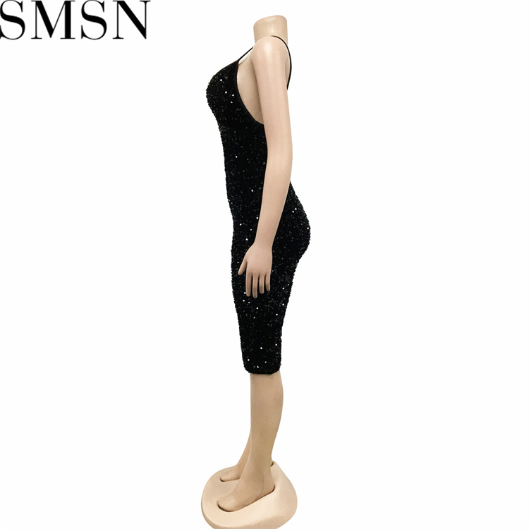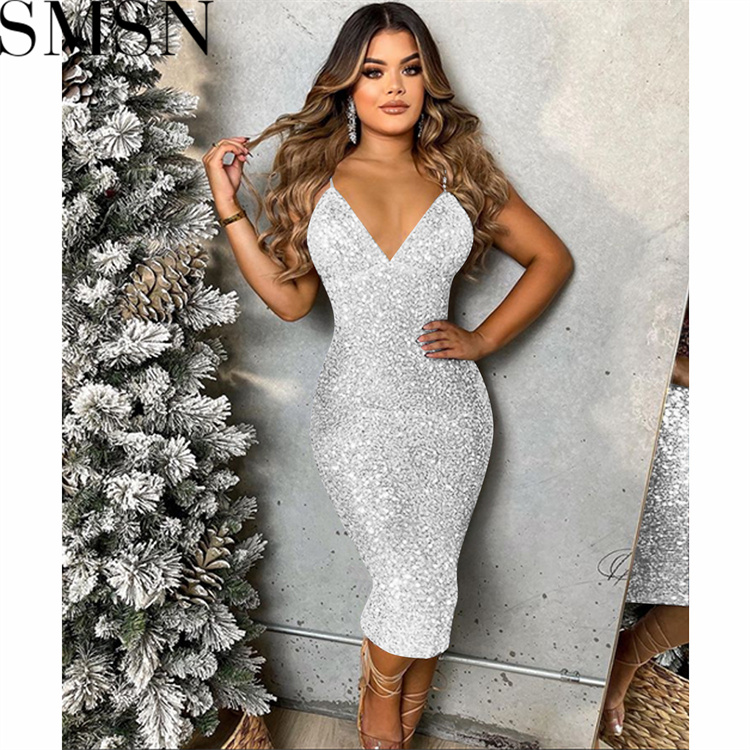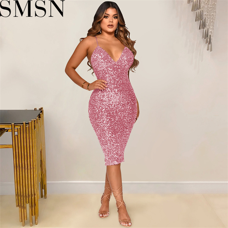 Casual Dress new pure color sequins sexy V neck brace midi dress for women