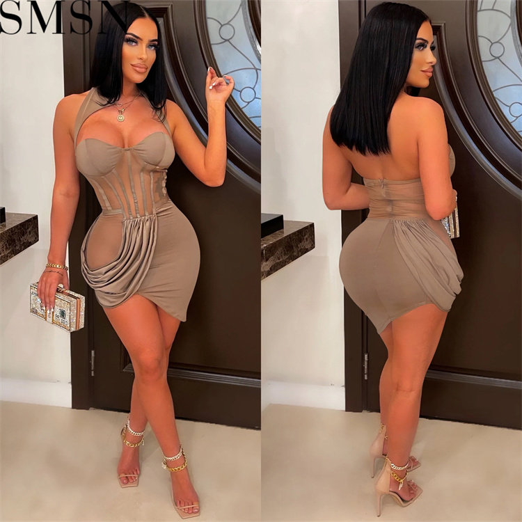 Casual Dress pure color mesh see through wrapped chest pleated irregular skirt dress for women