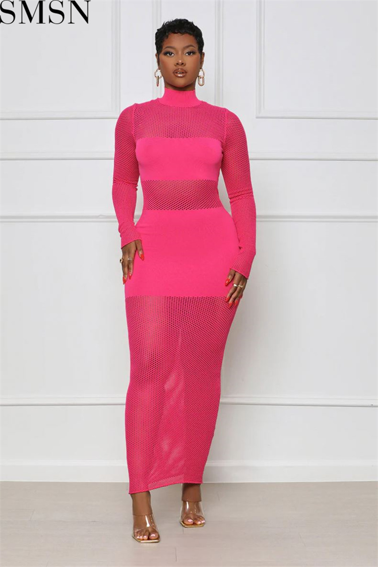 Plus Size Dress Amazon Popular Sexy Solid Color Mesh Stitching Long Sleeves Dress
