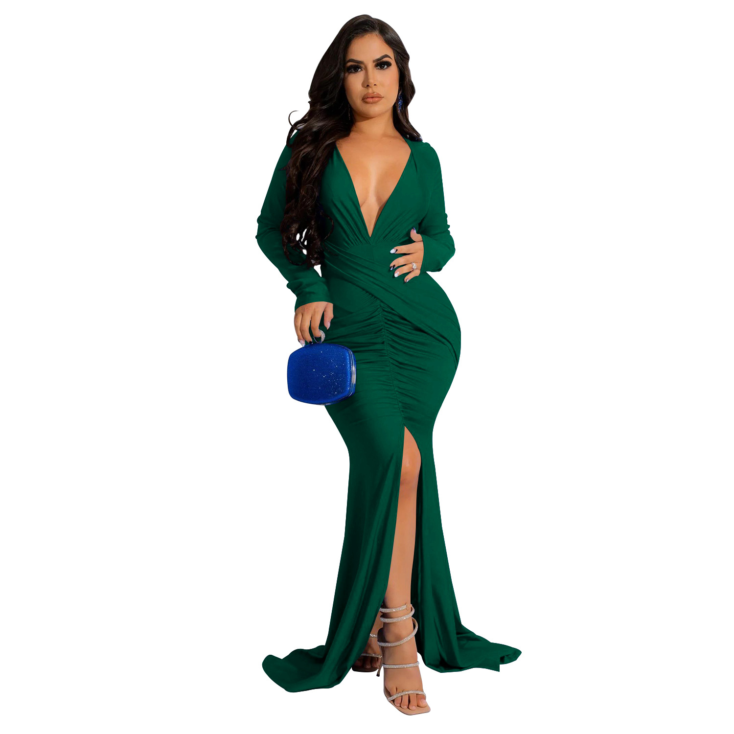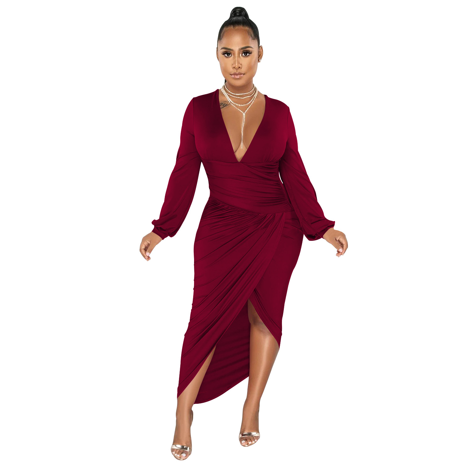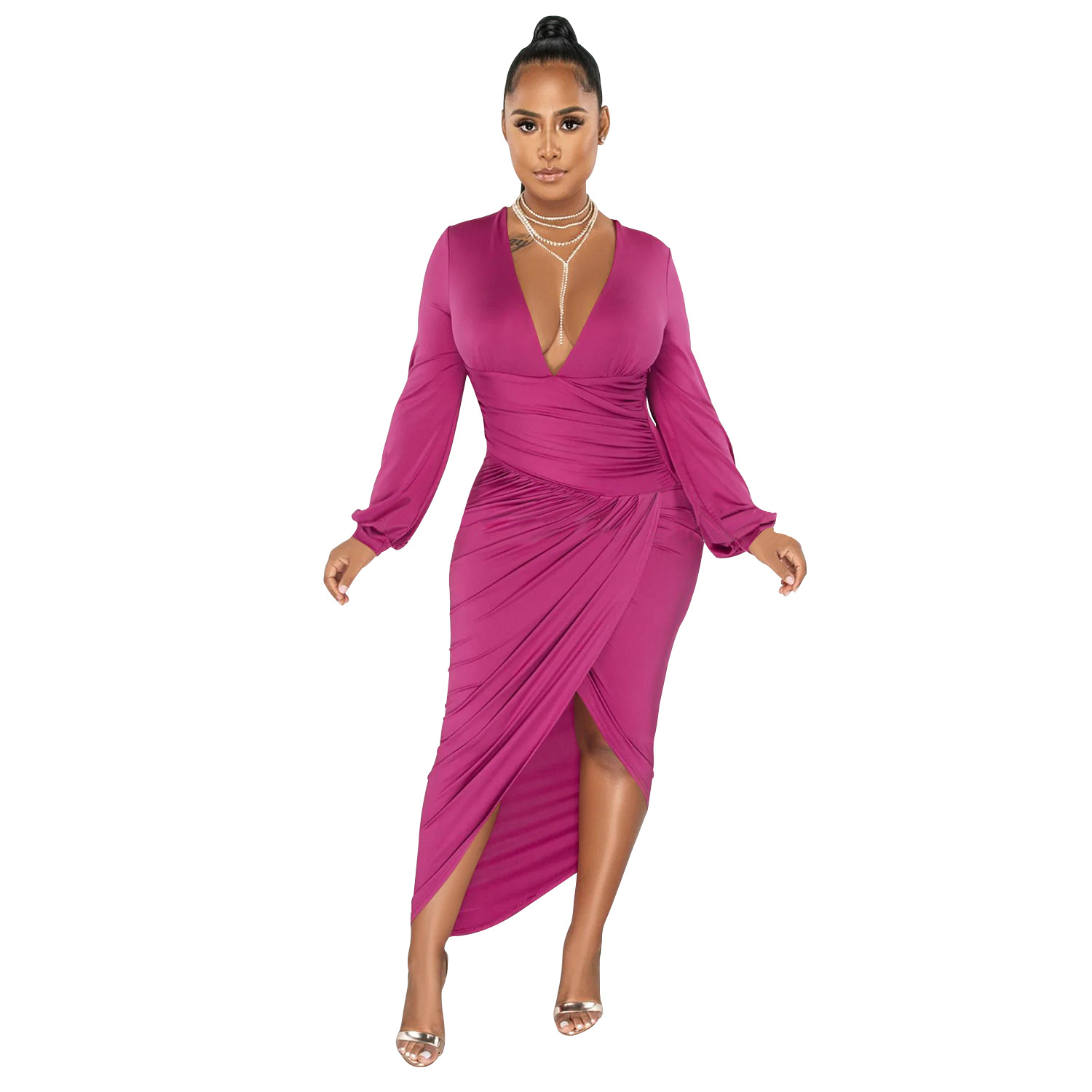 Plus Size Dre Amazon European and American fashion solid color and V neck long sleeve dress